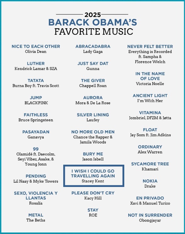 Barack Obama chooses Stacey’s I WISH I COULD GO TRAVELLING AGAIN for his FAVORITE MUSIC OF 2025 list . The song was written for Stacey by Nobel prize-winning author, Kazuo Ishiguro, with music by her husband, Jim Tomlinson.
